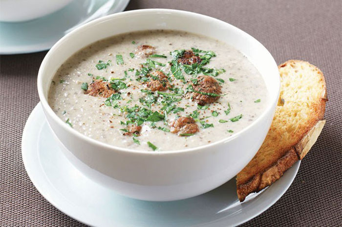 Gljive narežite na trake, nasjeckajte luk i špinat. Sve pržite na ulju i, dolijevejući malo pomalo vrelu juhu, kuhajte 5 minuta. Potom pojačajte vatru i nastavite kuhati oko 10 minuta.