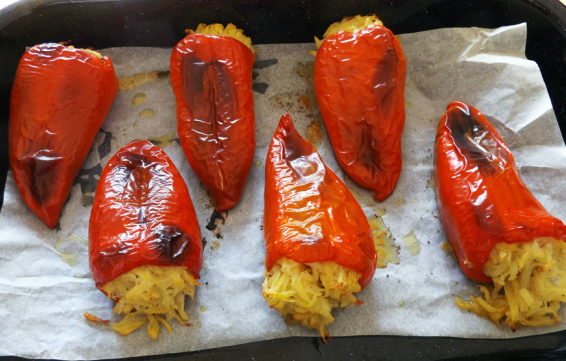 Rukama jako stisnite krumpire te iscijedite iz njih svu tekućinu. Punite krumpirima paprike, složite na papir za pečenje, prelijte s malo maslinovog ulja i pecite.