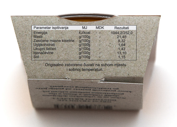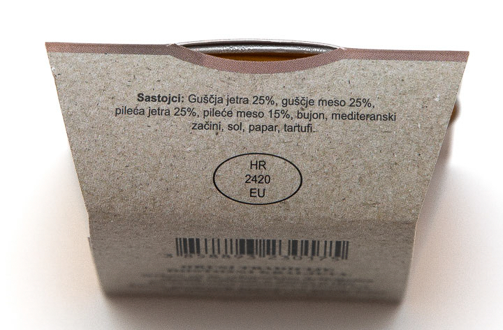 Fino usitnjeni pate s 25% guščje jetre i aromom tartufa, koji ovom delikatesnom proizvodu daju